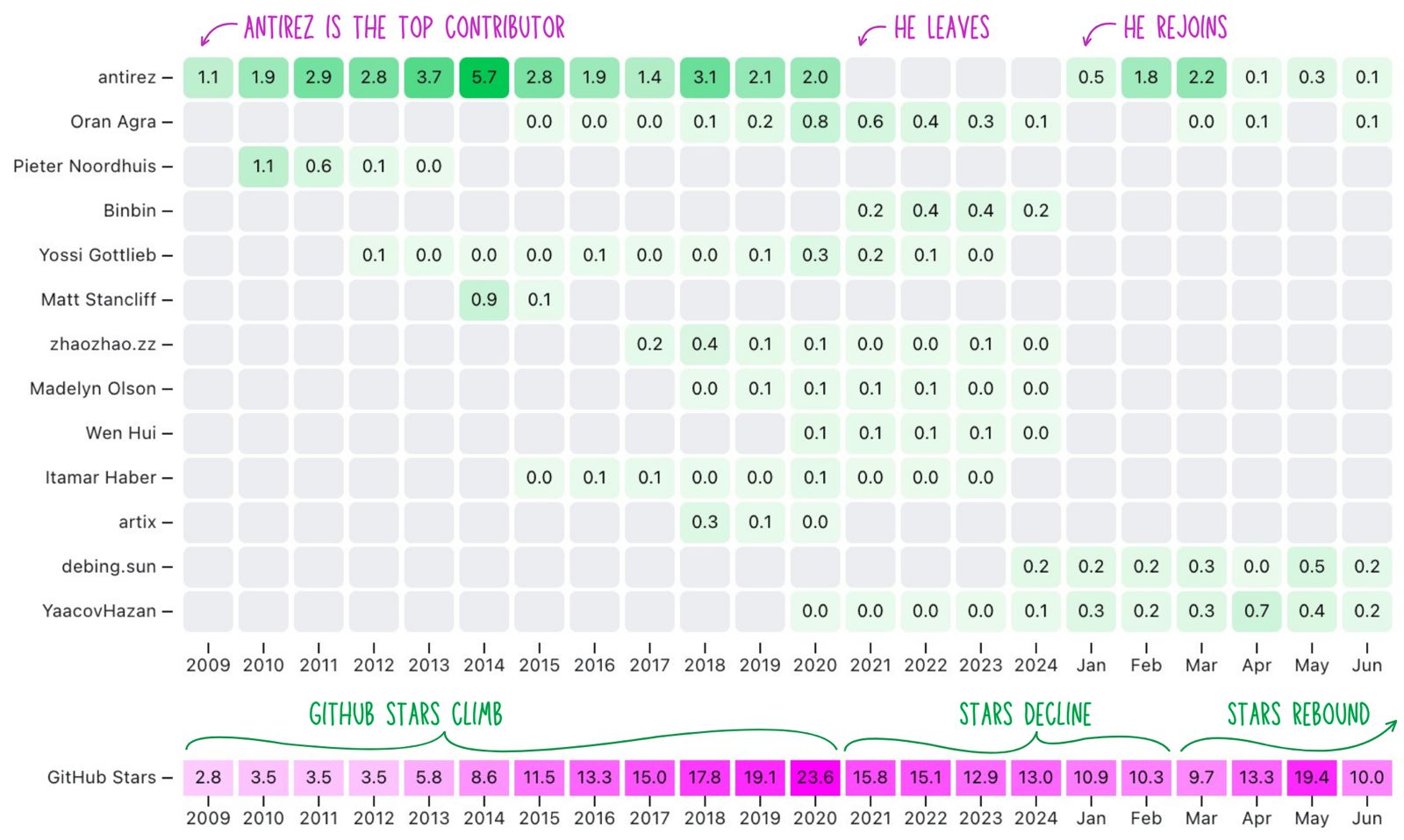 This is what the first year of Redis looked like: